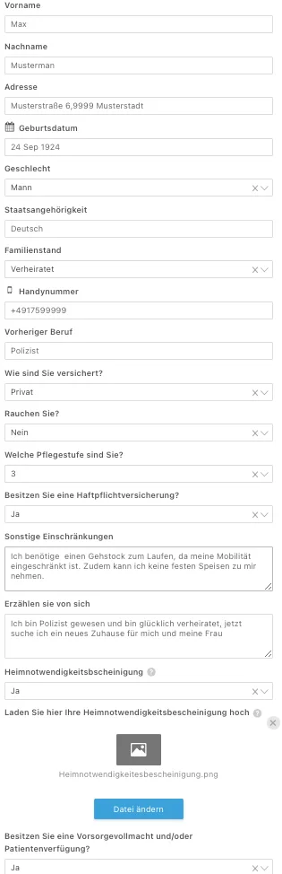 Hochladen von Dokumenten: Falls erforderlich, laden Sie wichtige Dokumente wie Heimnotwendigkeitsbescheinigungen hoch. Diese Dokumente sind oft ein entscheidender Schritt bei der Bewerbung für Altersheime.